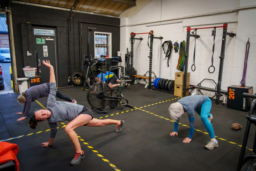 A mixture of HIIT and metcon style workouts using kettlebells, dumbbells, wall balls, bodyweight movements and cardio equipment.